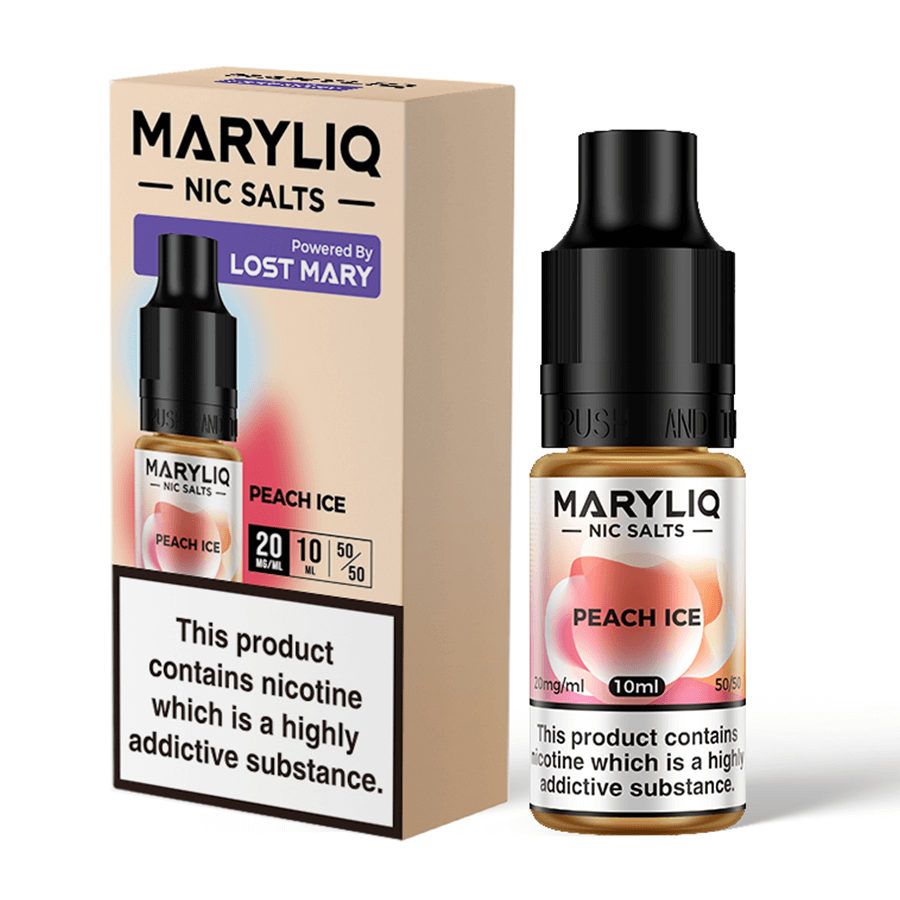 Peach Ice Maryliq Nic Salt E-Liquid by Lost Mary is a juicy and refreshing blend of sweet, ripe peaches with a frosty menthol finish for a smooth and cooling vape.